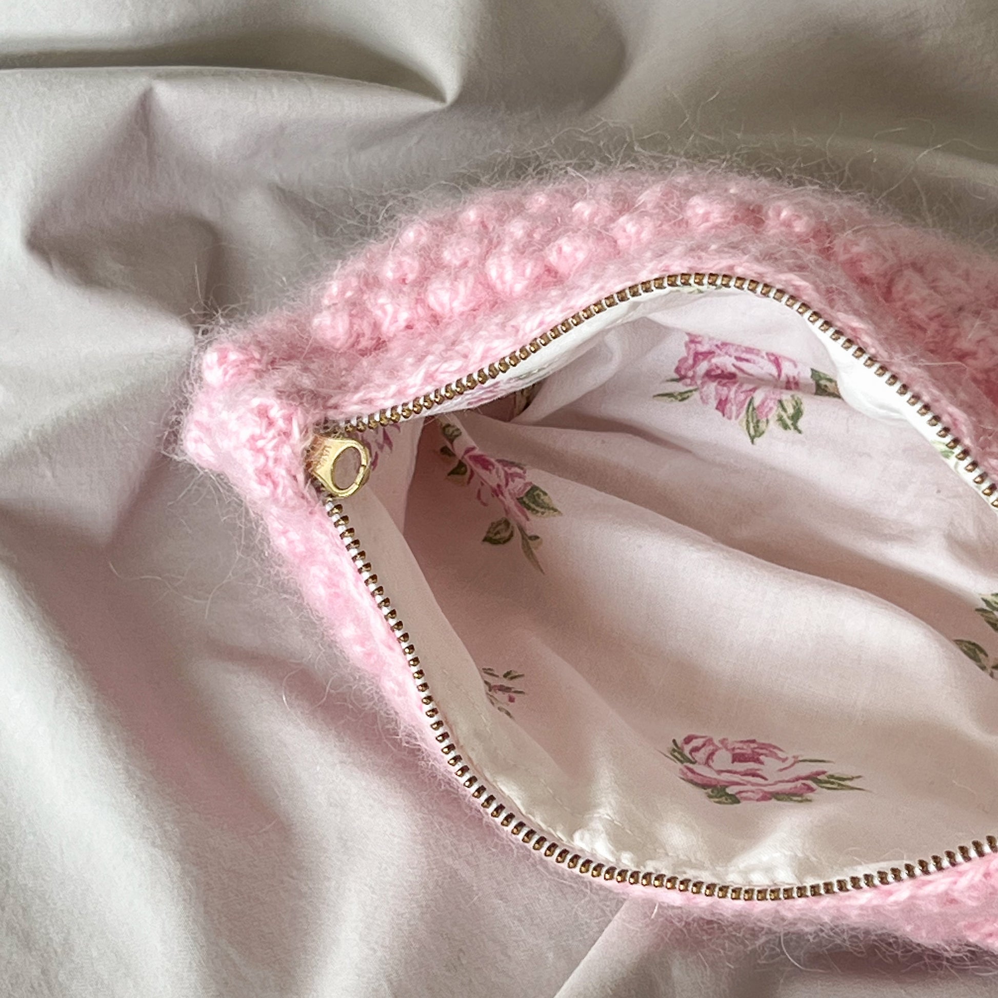 The mohair bubble bag is crocheted in a soft and fluffy mohair blend. This handmade bubble bag features a lovely bubble crochet pattern and has an elegant gold zipper. The clutch is lined with specially selected vintage textiles, which makes each bubble bag completely unique.