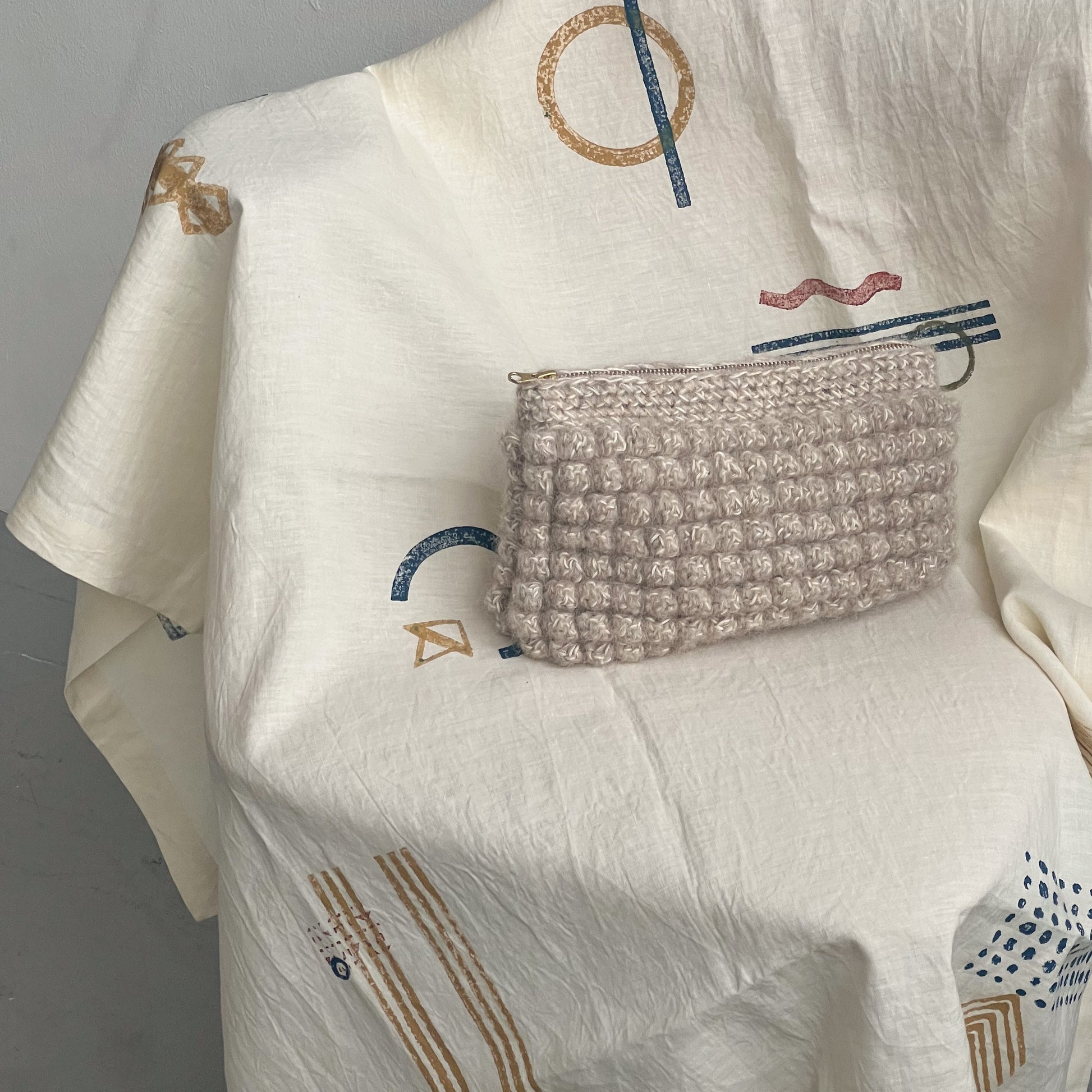 The original bubble bag is crocheted in soft and fluffy alpaca wool and a thread of cotton to maintain the shape of the clutch. This handmade bubble bag features a lovely bubble crochet pattern and has an elegant gold zipper. The clutch is lined with specially selected vintage textiles, which makes each bubble bag completely unique.