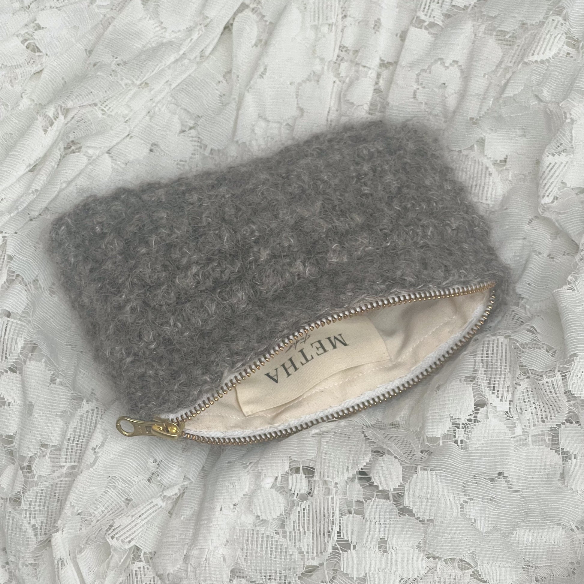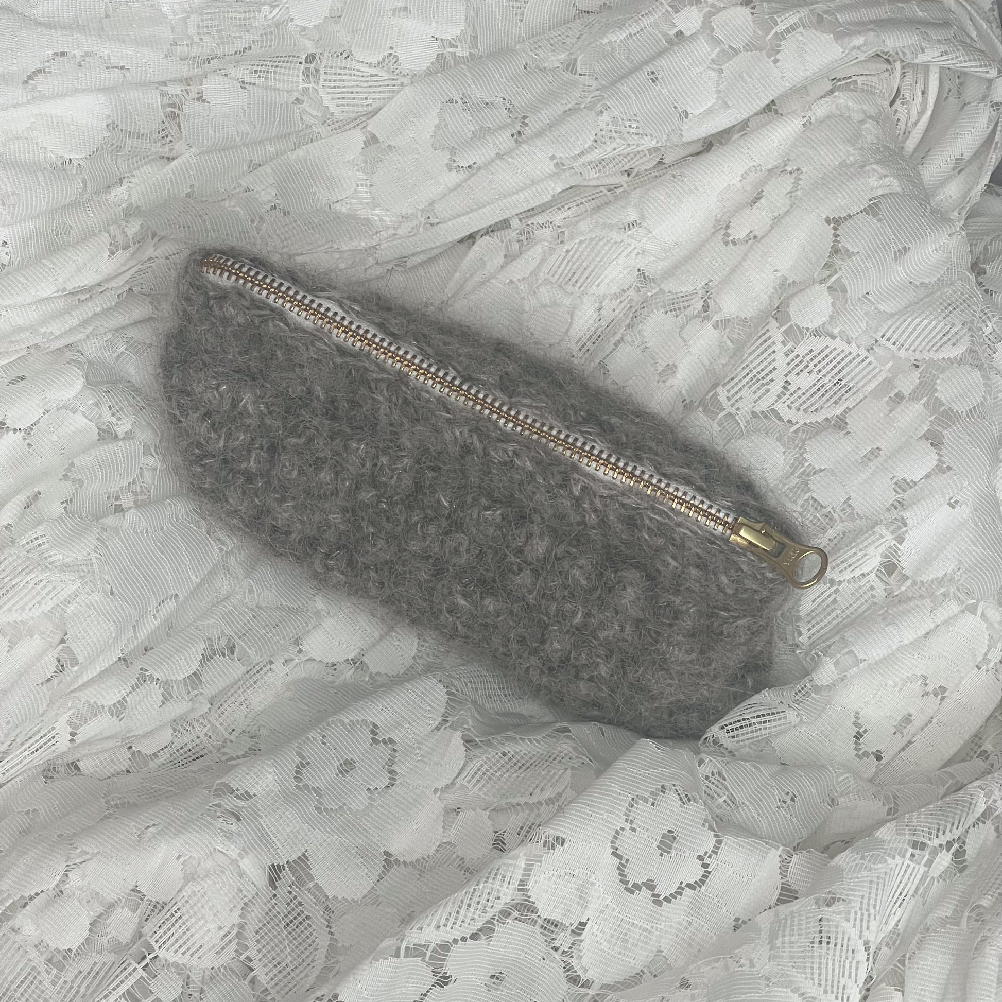 The petite bubble bag is crocheted in 100% soft and fluffy alpaca wool. This handmade bubble bag features a lovely bubble crochet pattern and has an elegant gold zipper. The clutch is lined with specially selected vintage textiles, which makes each bubble bag completely unique.